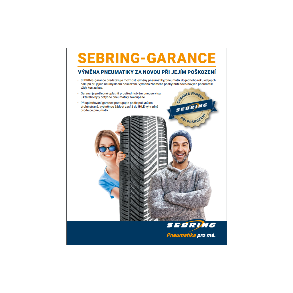 Na pneumatiky Sebring poskytujeme 1 rok garanci na poškození výměnou kus za kus, pokud pneumatiky montujeme v našem pneuservisu.